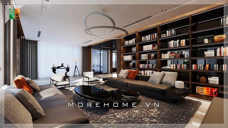 Đầy ấn tượng với thiết kế phòng khách rộng của biệt thự, nhà phố phong cách hiện đại nội thất kệ gỗ óc chó cao cấp.