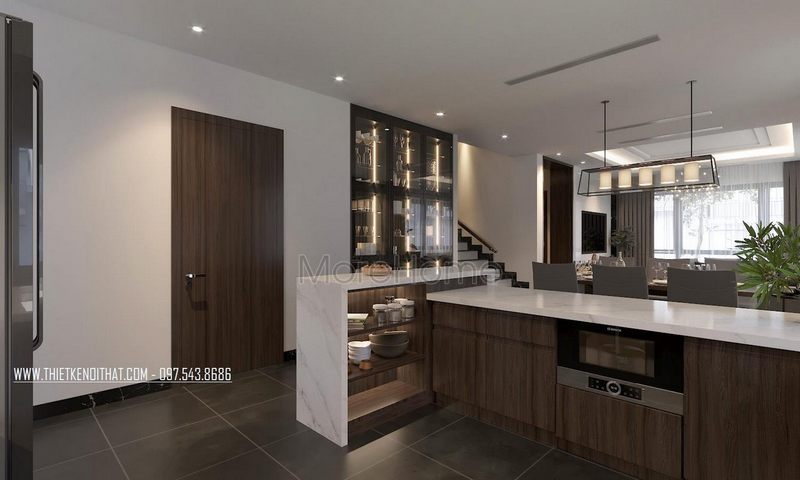 Phòng ăn liền bếp giúp cho diện tích thông thoáng thuận tiện cho sinh hoạt đem lại sự hiện đại cho căn nhà