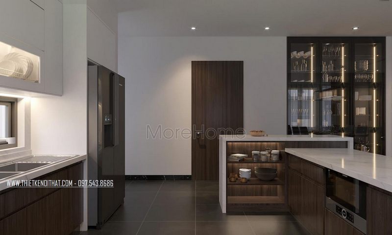 Thiết kế không gian phòng bếp hiện đại ăn thoáng mát sạch sẽ và sang trọng.